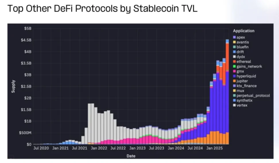 随着时间的推移,稳定币的供应在各种永续合约协议之间轮换,目前主要集中在 Hyperliquid、Jupiter 和 Ethereal 上。