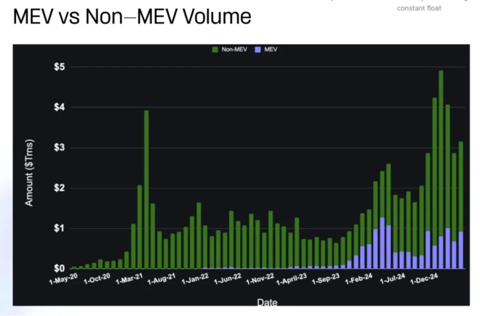 另一方面,所谓的 3.1 万亿美元年交易量极具误导性,其中 31% 源于 MEV 机器人通过每日数千次循环操作,反复使用同一笔资金所贡献,真正由人类实际参与的交易量远低于表面数据所暗示的规模。