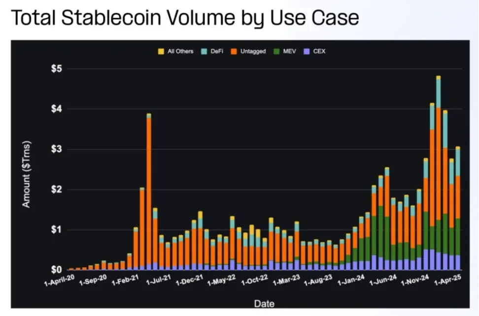 自 2023 年夏季以来,稳定币的总交易量稳步攀升,在市场活跃度高的时候会出现异常激增。DeFi 的交易量增幅最高,而 MEV 和未标记钱包的交易量较高但波动较大。