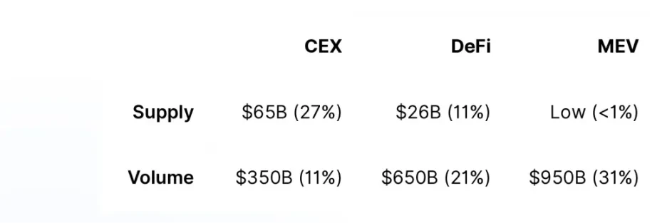 中心化交易所锚定的稳定币供应,在生态系统中占据了很大一部分流通量。就交易量而言,DeFi 协议和 MEV 驱动的参与者目前最为活跃,凸显了链上应用和可组合基础设施日益增长的作用。