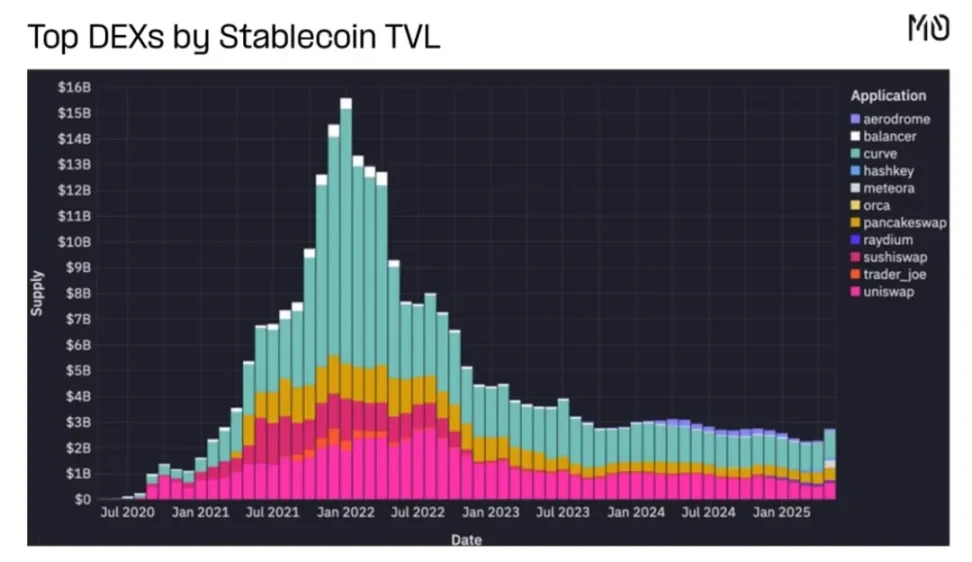 集中的流动性、以稳定币为中心的 DEX 以及跨协议可组合性降低了 DEX 维持高稳定币浮动的需求。