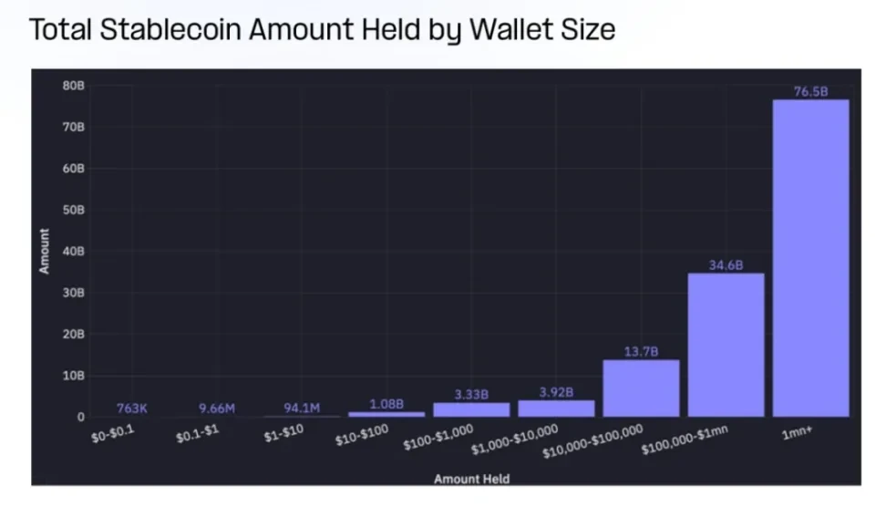 大多数钱包规模很小,但大多数未归属的稳定币都掌握在少数高价值群体手中。这种分布反映了稳定币使用的双重性质:一方面是广泛的基层用户,另一方面是高度集中于机构用户或巨鲸用户。