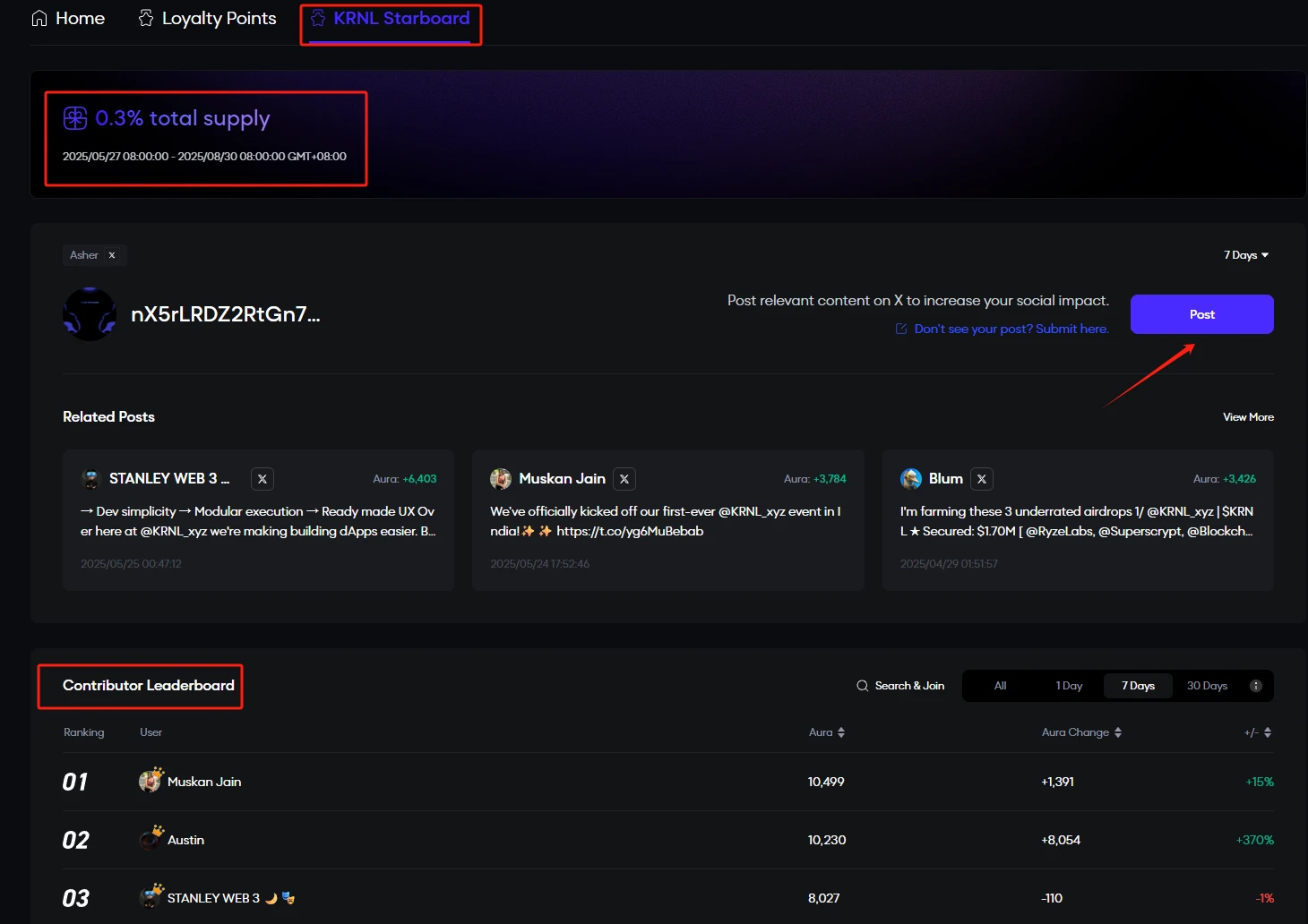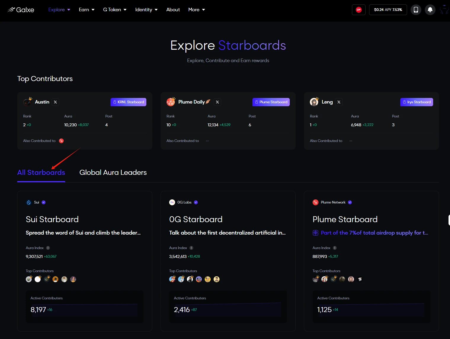STEP 2. 参与面板中各个项目社交任务,关注 Galxe 与准备发帖项目的官推,转发、评论指定推文记得带上标签 #Starboard 、 #Galxe ,互动量越高,所获得 Aura 积分越高(对应页面下方可看到积分排行榜),有些项目会在此界面展示空投代币总量。
