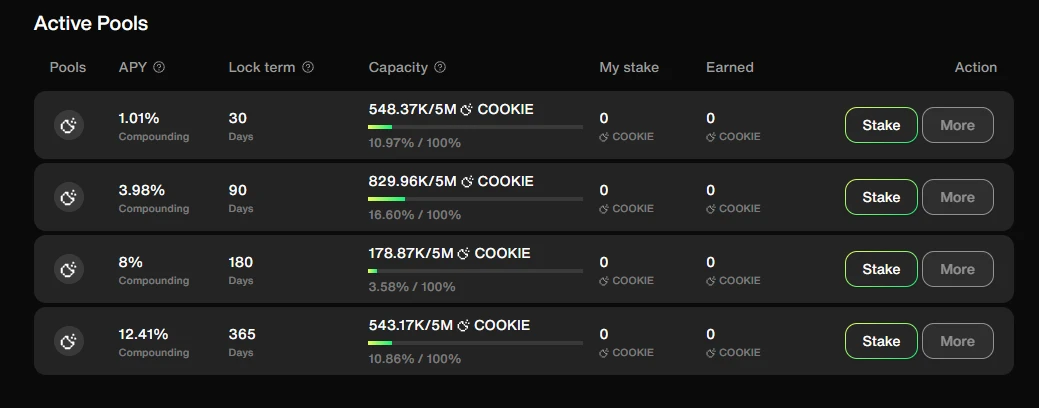 STEP 2. 质押 COOKIE 代币, 质押的积分规则如下(质押链接: https://www.cookie.community/staking ):