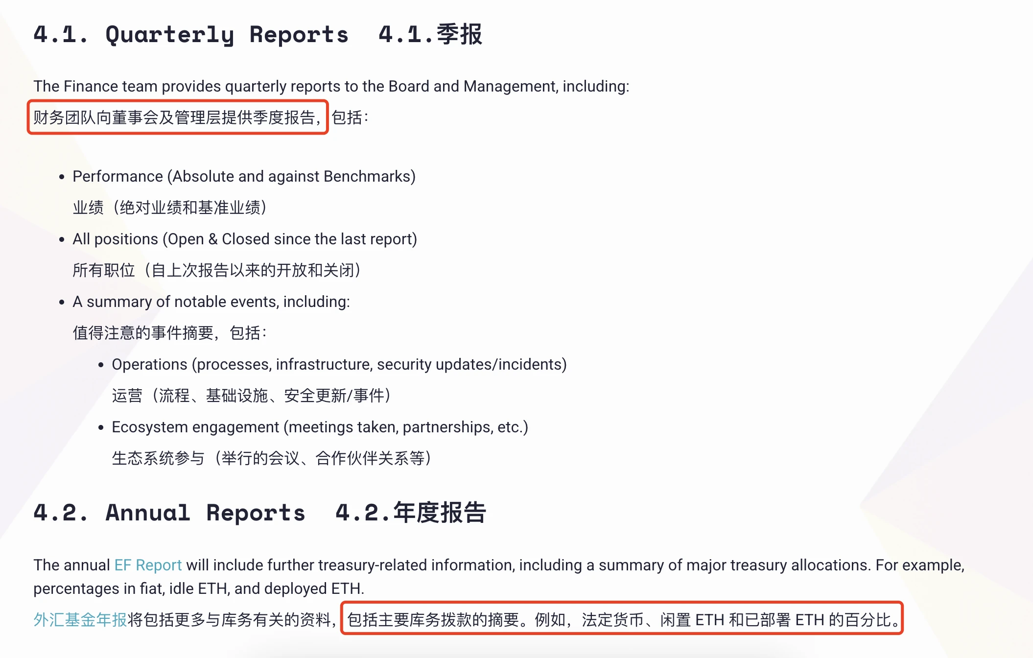 二、EF 将优先支持安全、去中心化、开源的 DeFi 协议,采用如 wETH 质押、稳定币借贷等方式获取合理收益,并探索 Tokenized RWA(代币化真实资产)配置。此外, 为了进一步提升资产花费的透明度,EF 将由财务团队编制和维护具体的季度报告和年度报告,并根据范围和敏感性进行分发。