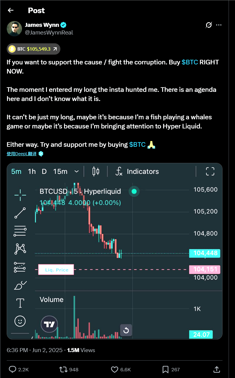而 6 月 3 日,James Wynn 在其总价值约 1 亿美元的 BTC 多单扭亏转盈之后,已悄然将昨日 22 时公开的「乞讨」推文删除。目前,其多单盈利超 40 万美元。而昨夜最惊险时,比特币价格距离 James Wynn 多单仓位的清算价只差 20 美元的空间,浮亏超 135 万美元。