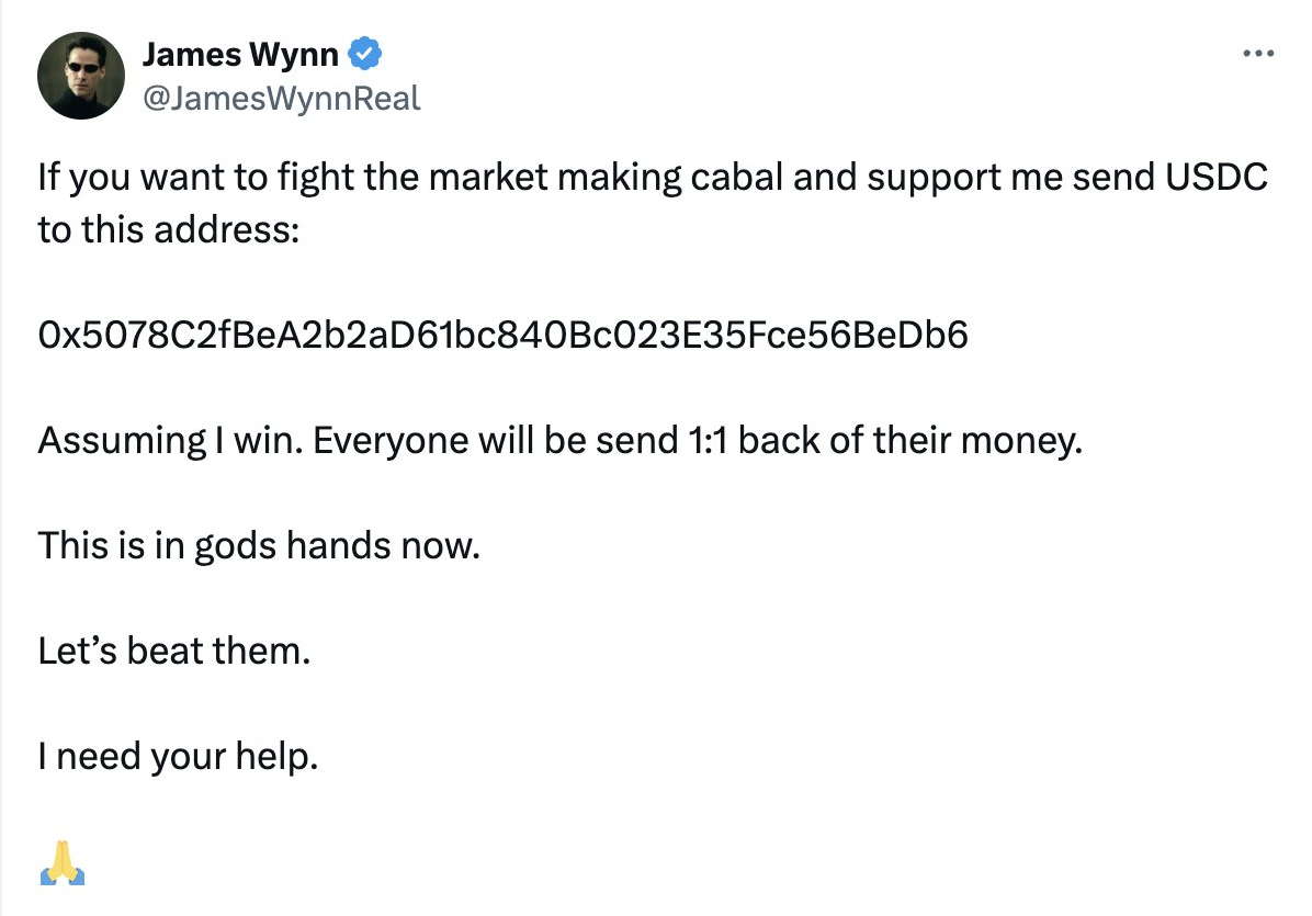 6 月 2 日,高挥加密自由、透明大旗的 James Wynn 在社交媒体上发文宣布决定暂停进行合约交易。