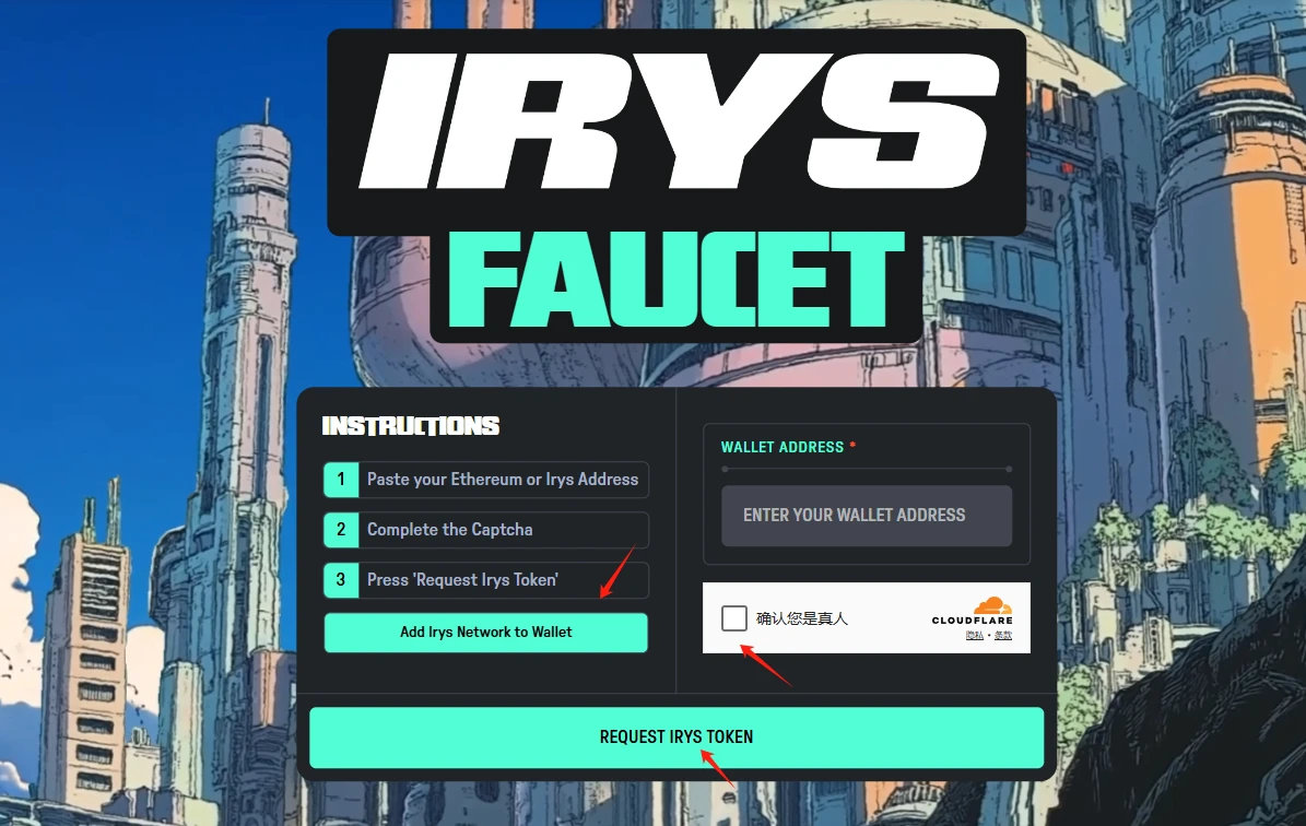 STEP 1. 添加测试网络并进行人机验证,领取每日 0.1 枚测试币(领取链接: https://irys.xyz/faucet )。