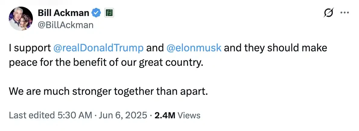Pershing Square 的创始人亿万富翁比尔·阿克曼(Bill Ackman)最先站出来表示特朗普和马斯克应该以国家利益为重,他在 X 上表示,「我支持 @realDonaldTrump 和 @elonmusk,他们应该握手言和,为我们伟大国家的利益着想。团结在一起,我们会比各自为战更加强大。」