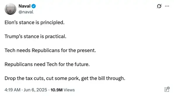相比之下,来自经济界、科技圈的声音更容易被视为「立场表达」而非「派系宣战」。硅谷投资人、创业者与思想者,AngelList 联合创始人 Naval Ravikant 就直接表态:「Elon 的立场是出于原则,特朗普的立场是出于现实。科技行业当下离不开共和党,共和党未来也离不开科技行业。别再减税了,砍掉一些冗余开支,把法案过了吧。」