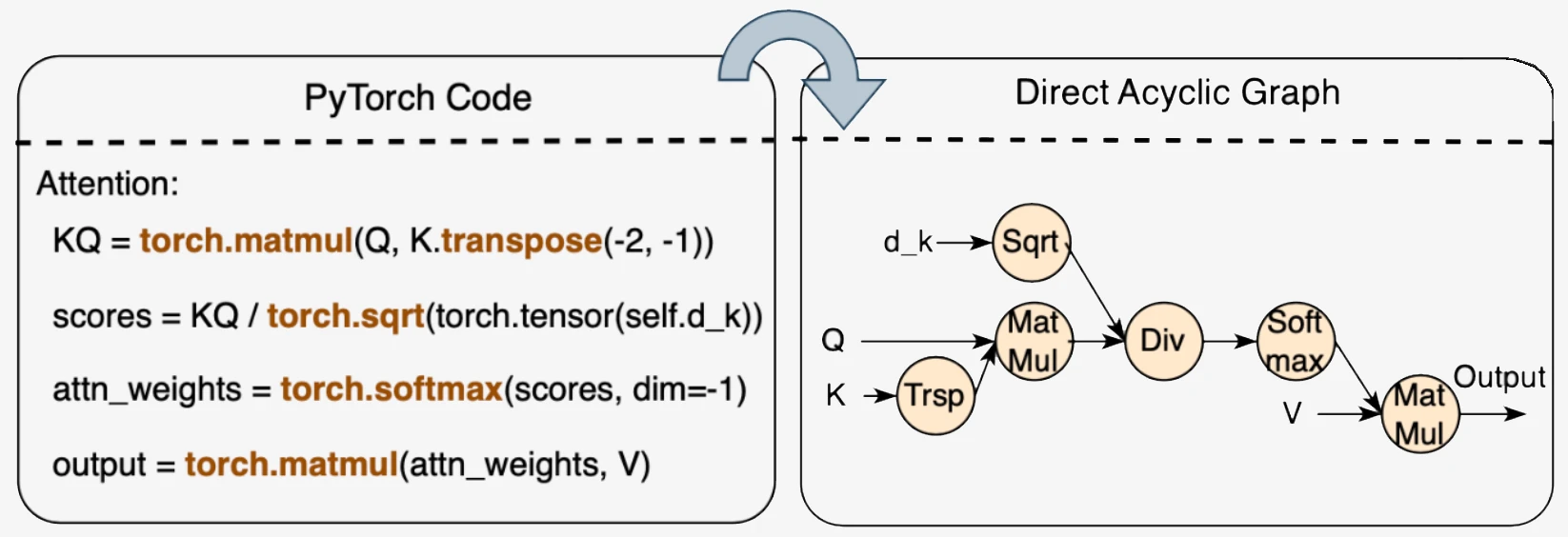 zkPyTorch 采用有向无环图(DAG)来管理机器学习的计算流程。DAG 结构能够系统化地捕捉复杂的模型依赖关系,如图 2 所示,图中每个节点代表一个具体的操作(如矩阵转置、矩阵乘法、除法和 Softmax),而边则精确描述了这些操作之间的数据流向。
