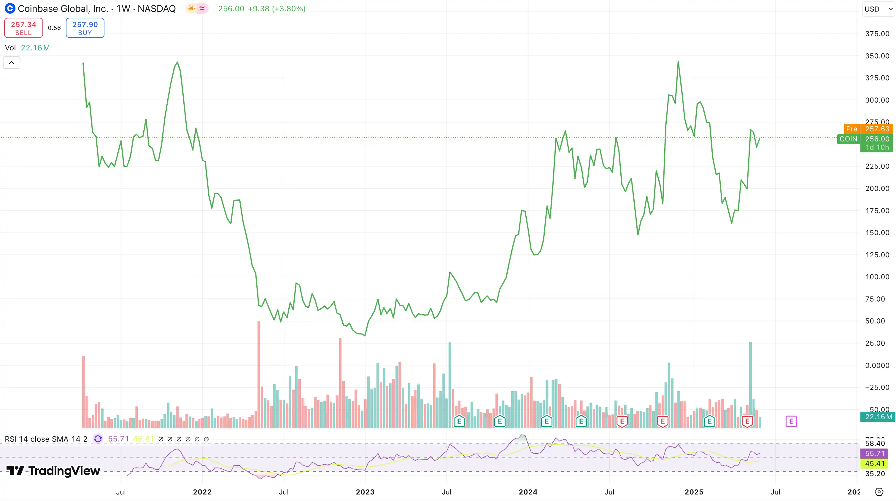 $COIN 价格走势,Coinbase 上市普遍被视为 2021 年加密市场牛转熊的重要标志;数据来源:Trading View