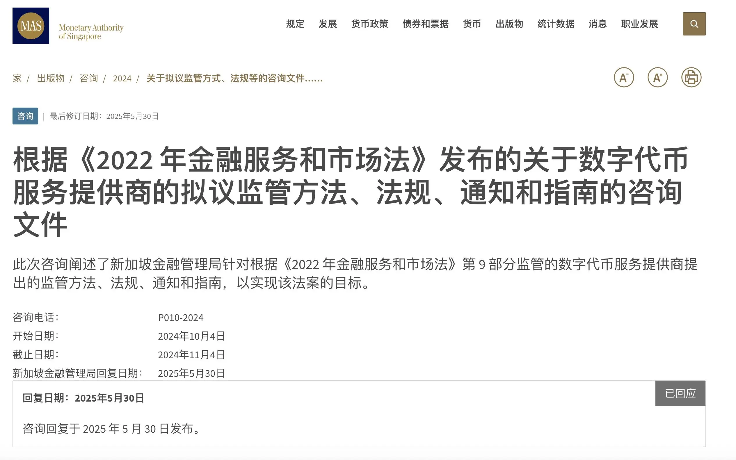 这并不是新加坡金融管理当局对加密货币公司的突然政策袭击,早在 2022 年,新加坡 MAS 就出台了《金融服务和市场法》,其中第九部分就是加密货币的监管,然后开展了多次公开咨询和征求意见稿, 5 月 30 日的文件则是回应咨询,同时详细阐述了具体的监管方法、法规、通知和 DTSP 发牌指南。