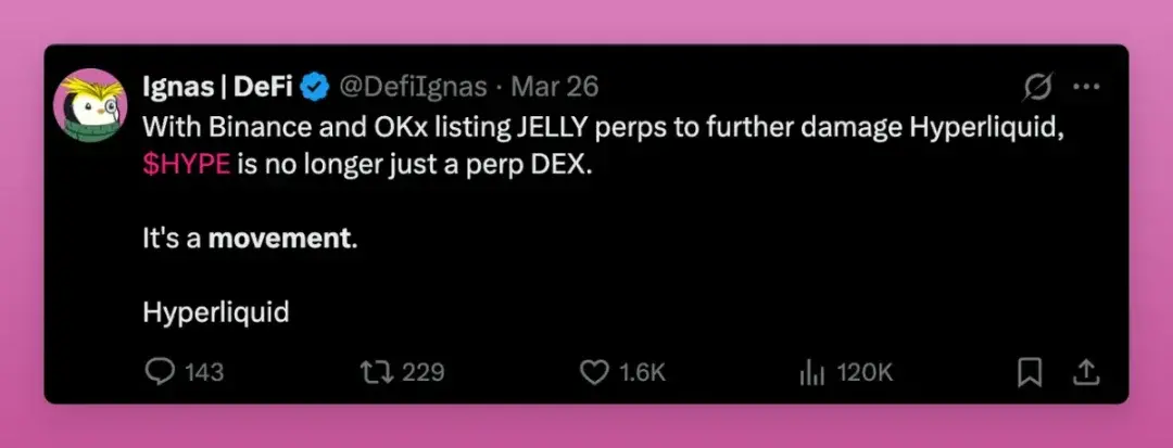 在我看来,Hyperliquid 是增长最快的社区。币安和 OKX 对 HYPE 的攻击反而增强了它的凝聚力,赋予社区支持团队和协议的使命与目标。Hyperliquid 已然成为一场运动。