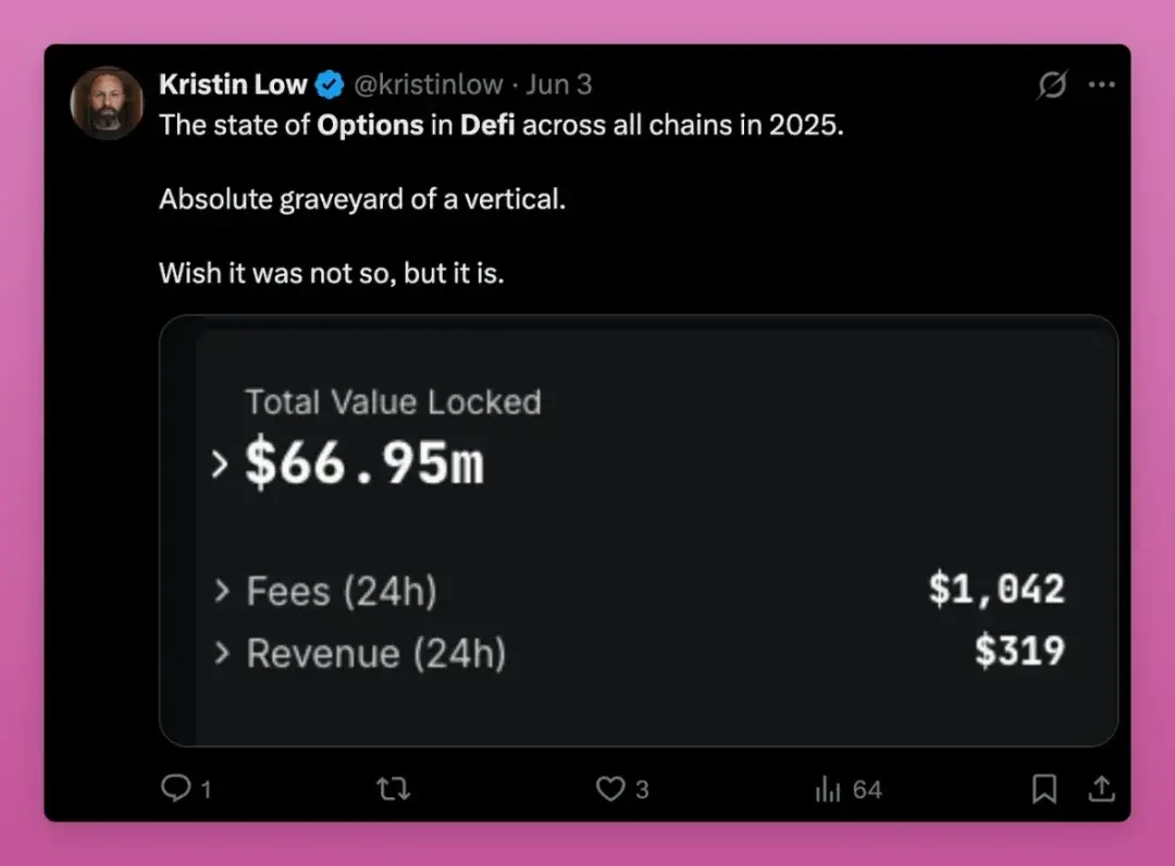 在近期市场波动中,我想用期权对冲投资组合,但链上流动性糟糕透顶。我曾对加密期权平台 Derive 抱有很高期望,但它的未来现在充满不确定性。