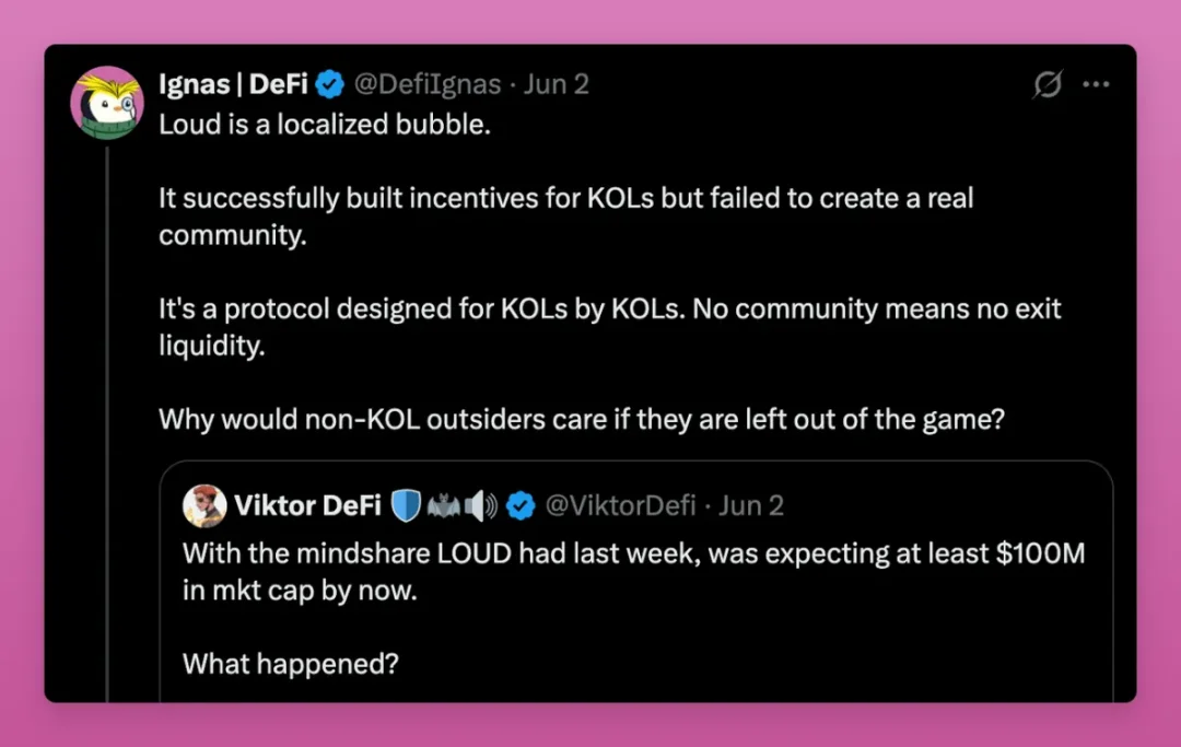 Kaito 提出的 「心智份额」(Mindshare)是一个优秀指标,但 Loudio 实验表明,拥有巨大的心智份额并不一定意味着建立了一个真正的社群。