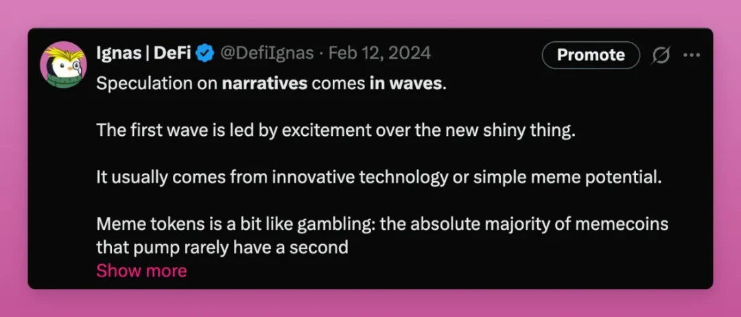 复杂叙事(如零知识证明、再质押)传播缓慢,简单或具有模因属性的叙事(如 WIF)传播迅速。你能在 5 秒内解释清楚这个概念吗?有梗吗?