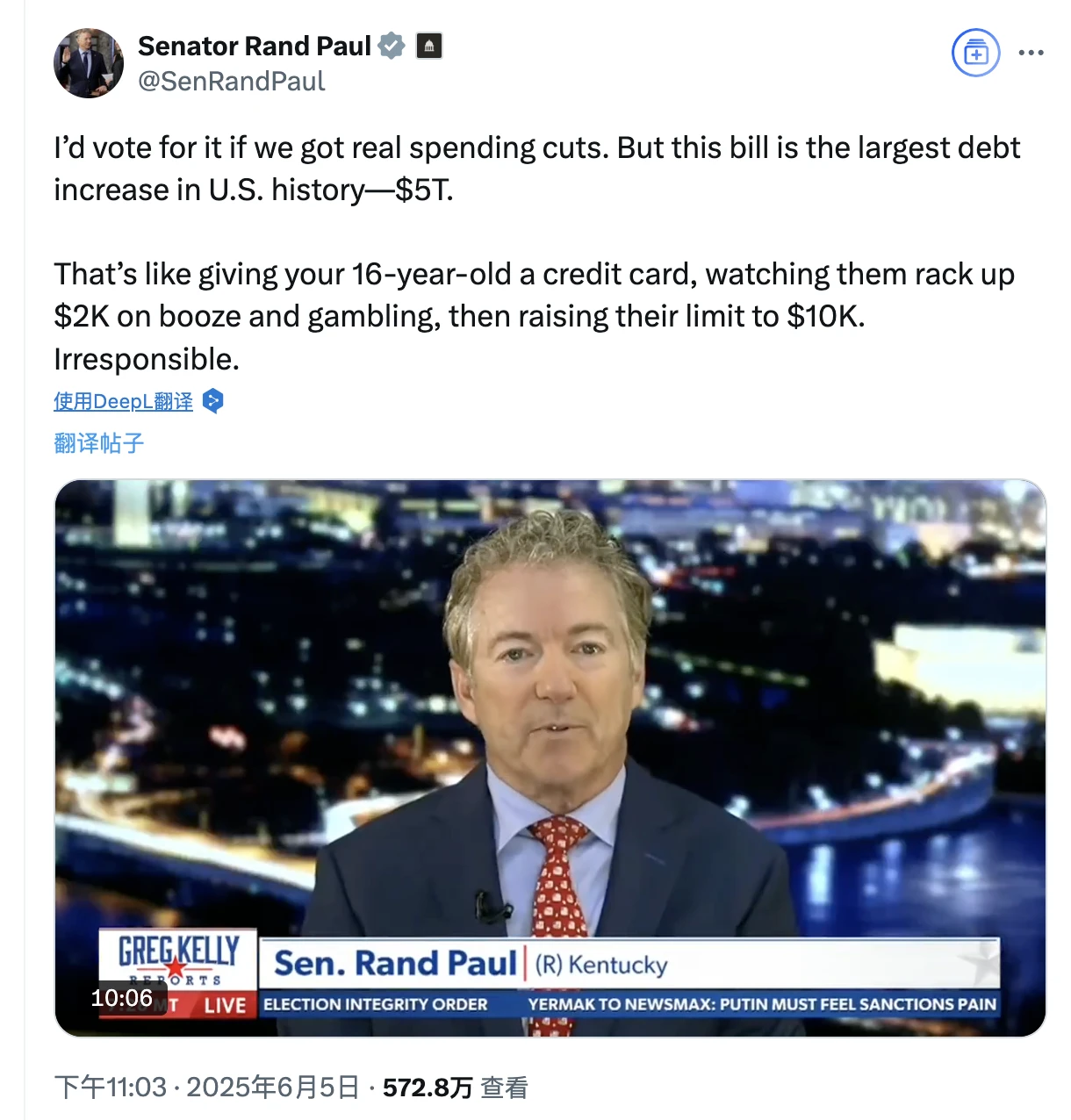 在民主党集体反对《美丽大法案》的情况下,共和党在参议院 53 席中最多只能失去 3 票。当前保守派如 Rand Paul 与 Mike Lee 已明确反对,马斯克则不断转发其发言扩大声量,法案前景充满不确定性。