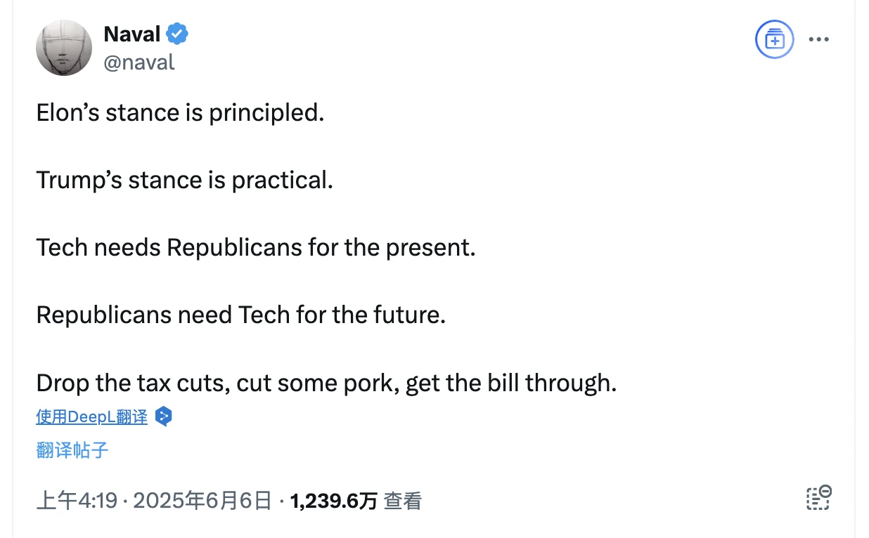 硅谷投资人 Naval Ravikant 在 X 称: “马斯克的立场是原则性的。特朗普的立场是务实性的。现在的技术需要共和党人的支持。共和党人需要未来的技术发展。放弃减税政策,削减一些开支,让法案通过。”
