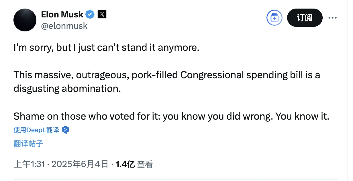 然而 2025 年春天,矛盾开始浮出水面:特朗普推动的《Big Beautiful Bill》计划取消电动车补贴与碳积分机制,直接砍断了特斯拉利润支柱,激怒了马斯克。 而真正点燃导火索的,是马斯克 6 月 3 日在 X 平台公开称该法案为 “令人作呕的畸形财政怪物” ,并引发了那条“核弹级”推文。