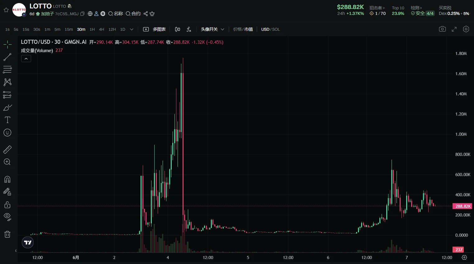 随后我发现了先于 BALL 的一个链上彩票项目 LOTTO,于 6 月 3 日 16 : 20 分左右, 17 万美元市值处上车,不到 10 分钟之后翻倍,全部出清离场。此后其市值飙升至 170 万美元,此次操作虽未踏空但卖飞了很多。
