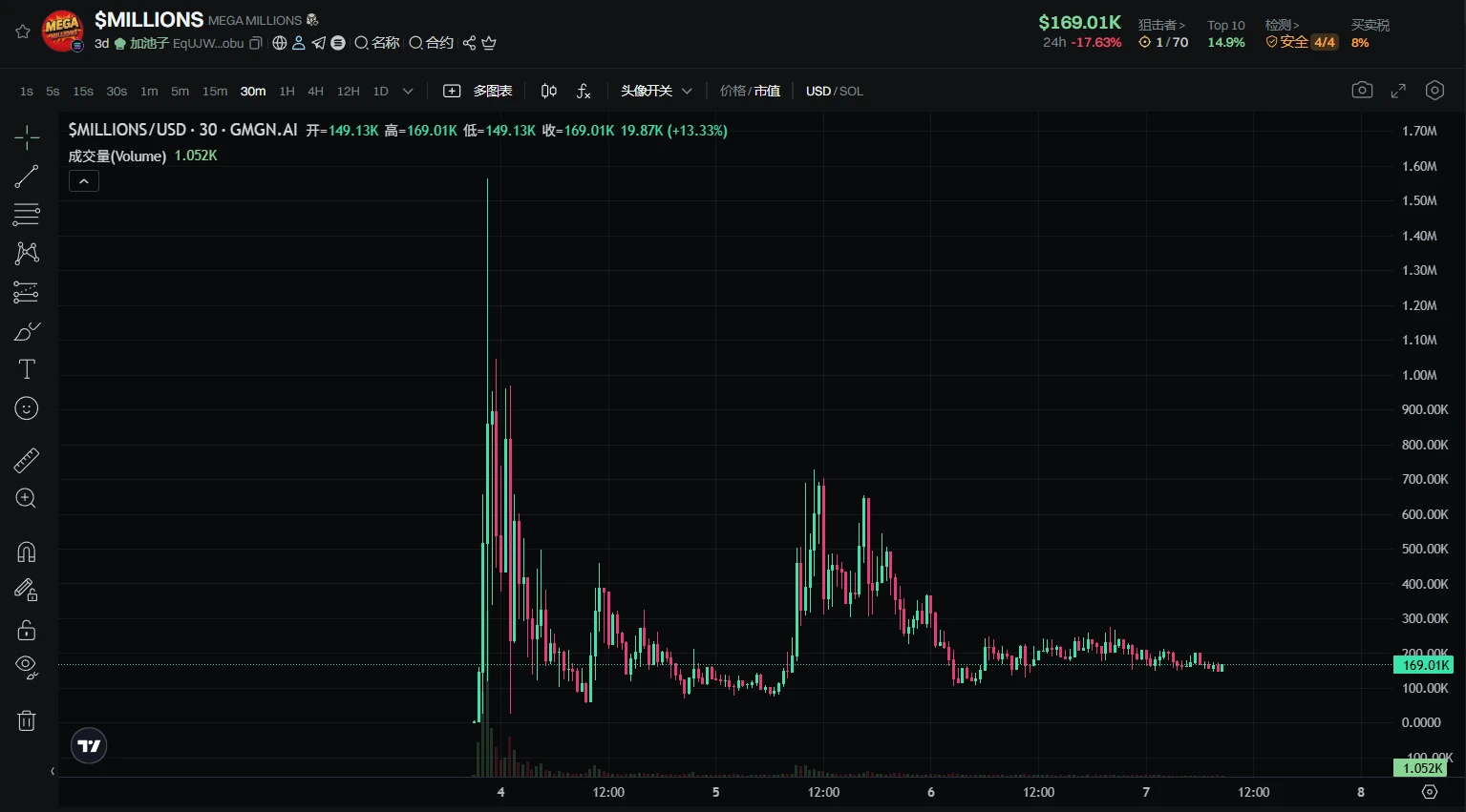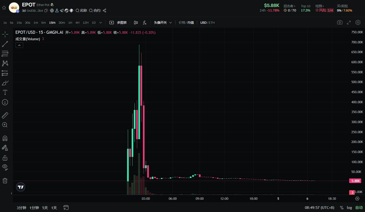 但是能预料到的是当市值过高,买入彩票的成本也就太高,没有人愿意在这里接盘,所以定会大幅波动,价格足够低,且情绪还在时就会有人抄底买入。