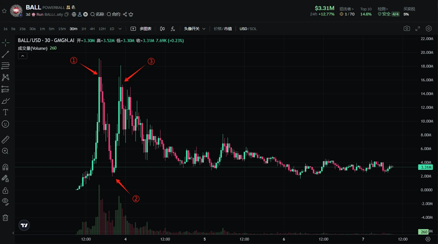 这个主打“在链上抽彩票”的代币,以“每小时开奖”吸引了大量链上赌徒。 GMGN 行情显示,其市值从百万起步一路拉升至 1900 万美元 (见下图①处),随后又在短短几小时内 暴跌至不足 200 万美元 (见下图②处),再次拉起、FOMO 爆发, 市值直逼前高 (见下图③处),仿佛在坐链上情绪的过山车。