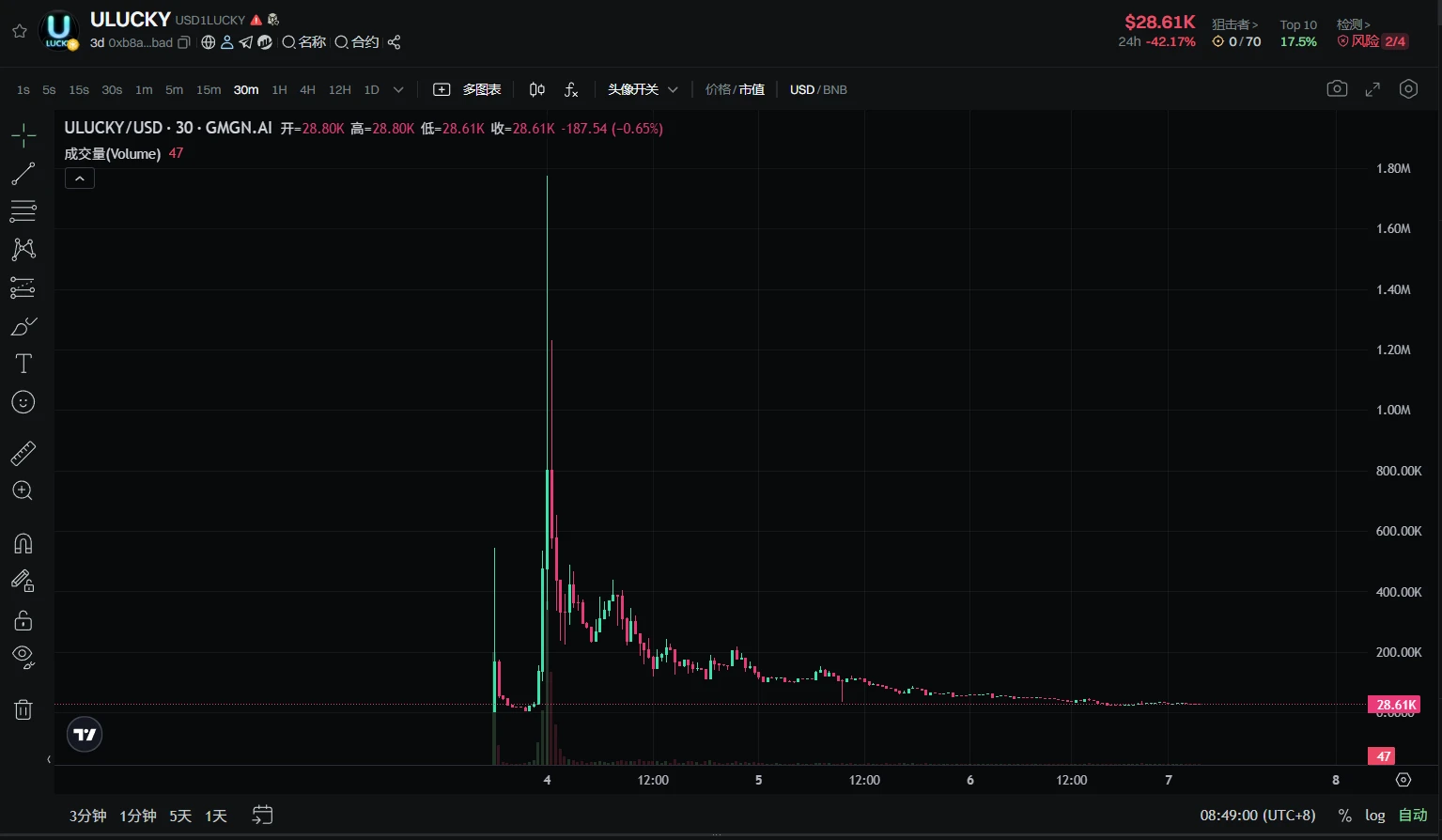 BSC 上的仿盘 ULUCKY,于当日 16 点左右发布,立即上涨至市值 50 万美元仅仅约 15 分钟后又接近完全归零,这时我与同事 南枳 均相继割肉离场,且并未参与到之后在约当日 23 时开始的第二波涨势,其市值一度冲至 180 万美元,没有在这中间进行抄底可谓是“拍断大腿”。