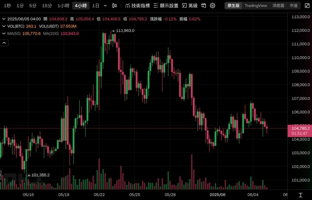 比 特币在五月创下历史新高(111,963 美元)后,目前上涨动能熄火,最低在 5 月 31 日回调至 103,078 美元。撰稿当下比特币暂报 104,785 美元,究竟是正在盘整累积突破动能、还是阶段性高点已到?目前没有非常明确的方向。