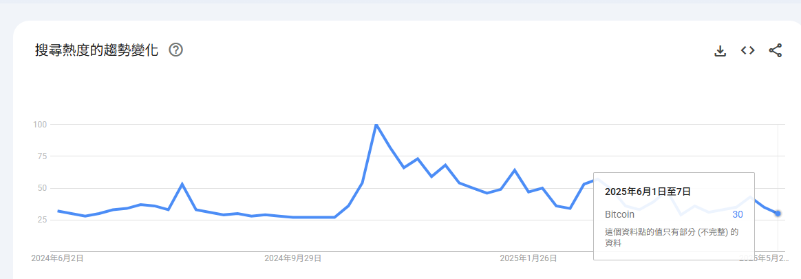 与此同时,据 Google Trends 最新 数据 显示,比特币目前在 Google 搜寻热榜上的排名,已经大幅下跌至第 25 位,搜寻热度指数为 30,创下自去年 10 月以来的新低。