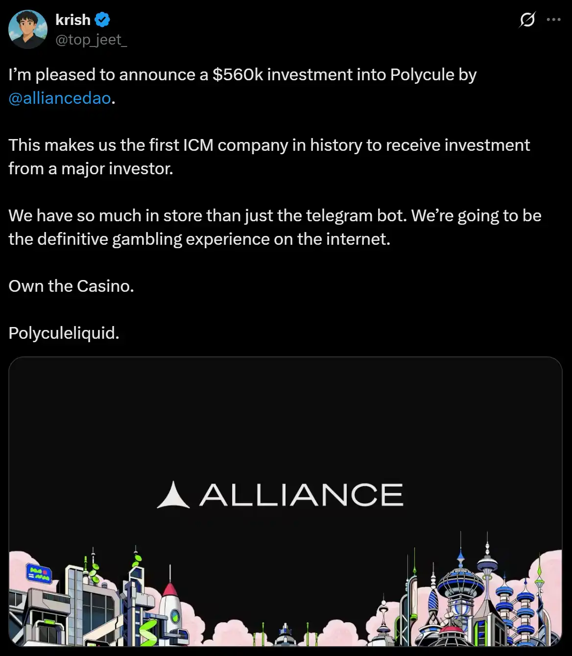 6 月 7 日,Polycule 创始人 krish 在 X 平台宣布,项目已获得来自 Alliance 的 56 万美元投资。Alliance 是 Web3 领域最具影响力的创业加速器之一,此轮融资将用于产品打磨与生态拓展。