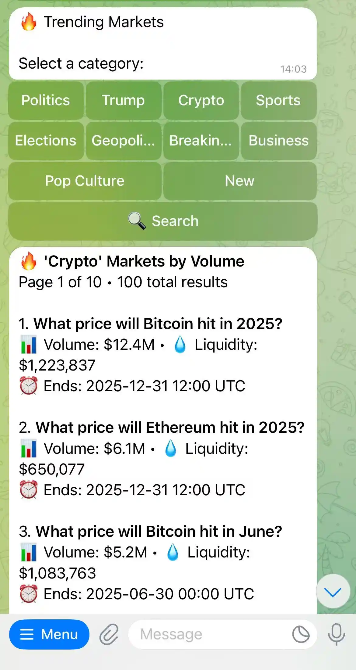 4、浏览与交易市场:通过指令查看市场或直接下单。机器人会提供简洁的界面显示价格、流动性与成交量信息。