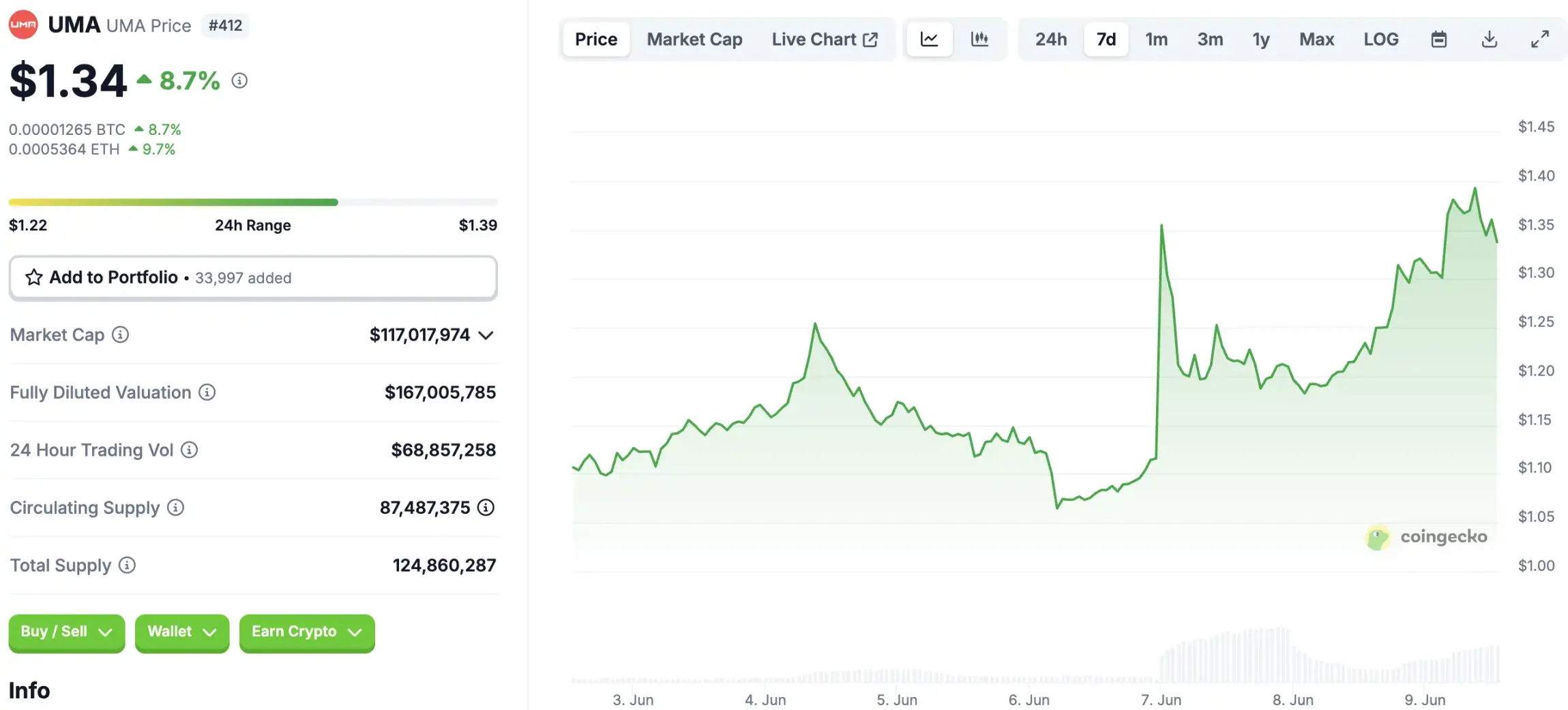 与此同时,市场也在寻找与此相关的直接炒作标的。UMA 是 Polymarket 的核心预言机,用于结算预测市场的结果,Polymarket 依赖 UMA 的 Optimistic Oracle 来确保市场结果的公正性和可靠性。