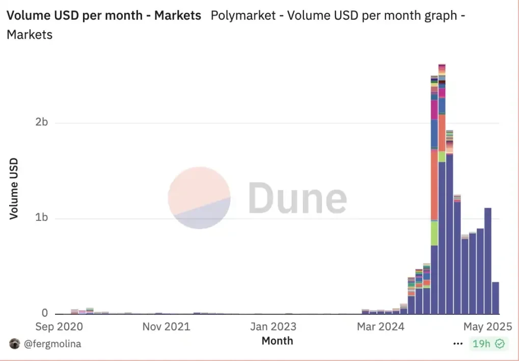 目前,Polymarket 的月度交易量在大选后逐步提升。