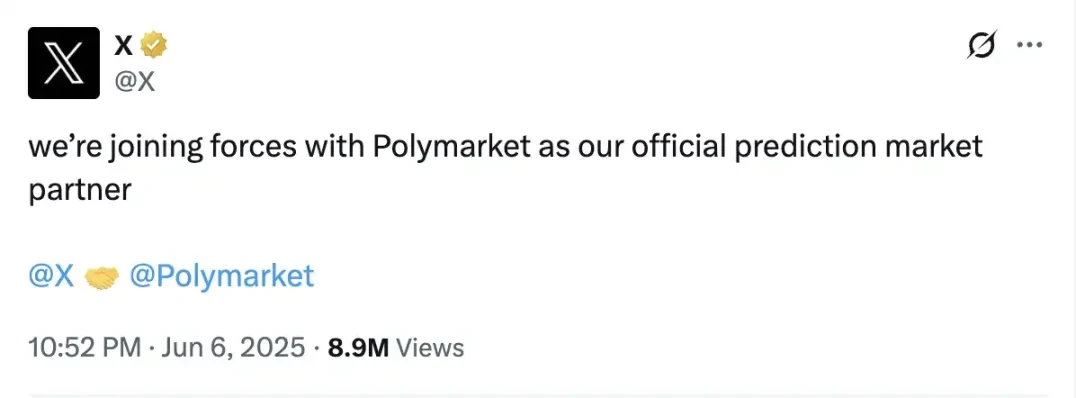 前几日,Polymarket 创始人 Shayne Coplan 宣布,Polymarket 已成为社交媒体巨头 X 及其人工智能团队 xAI 的「官方预测市场合作伙伴」。合作将 X 平台的数据与 Grok 的分析能力结合,为全球数百万 Polymarket 用户即时提供更具背景和数据支持的洞察。