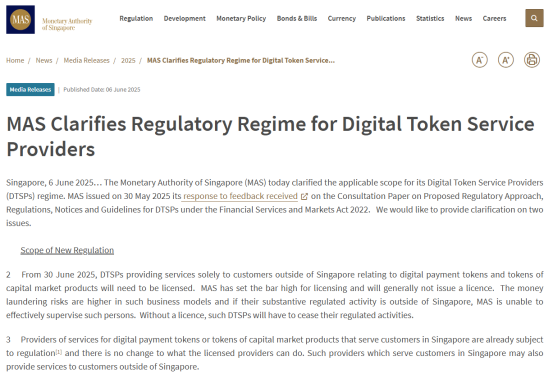 5月30日,新加坡金融管理局(MAS)发布数字代币服务提供商(DTSP)最终政策指南,宣布将于6月30日正式实施数字代币服务提供商(DTSP)新规。而根据新规要求,所有在新加坡注册或运营的加密服务提供商,若未取得DTSP牌照,须在2025年6月30日前停止向境外客户提供服务。