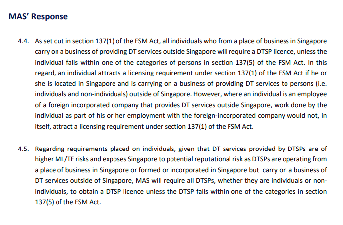 唯一值得庆幸的是,牌照制度存在一定的豁免空间。若已经在新加坡《证券与期货法》、《金融顾问法》以及《支付服务法》框架中获得牌照的企业,则无须再度申请DTSP,仅需要落实新规所需要的审计、风险管理等要求。这对于在此前相对宽松阶段已申请过牌照的企业而言,比较友好,从官网来看,COBO、ANTALPHA、CEFFU、MATRIXPORT等24家企业均在豁免名单之列。另一方面,若个人只是作为雇员远程办公,与新加坡海外注册主体签约,仅仅服务于海外客户,无须申请牌照,但若是以个人身份在新加坡当地参与业务,被纳入法规中。