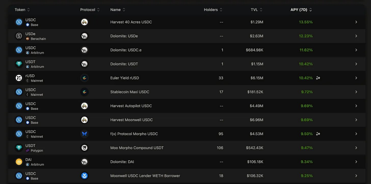 Vault 仪表盘严重依赖 USDC: 2025 年 1 月,Vault.fyi 上收益率排名前十的都是 USDC,其中 Revert Lend USDC 的年利率为 14.9% ,Gauntlet USDC Core 的年利率为 14.7% 。
