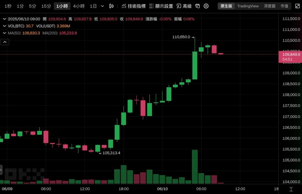 而在比特币市场方面,似乎受双方谈判进展顺利影响,今(10)晨五点后一度突破 11 万美元,最高触及 110,650 美元。截稿前暂有回调,现报 109,849 美元。