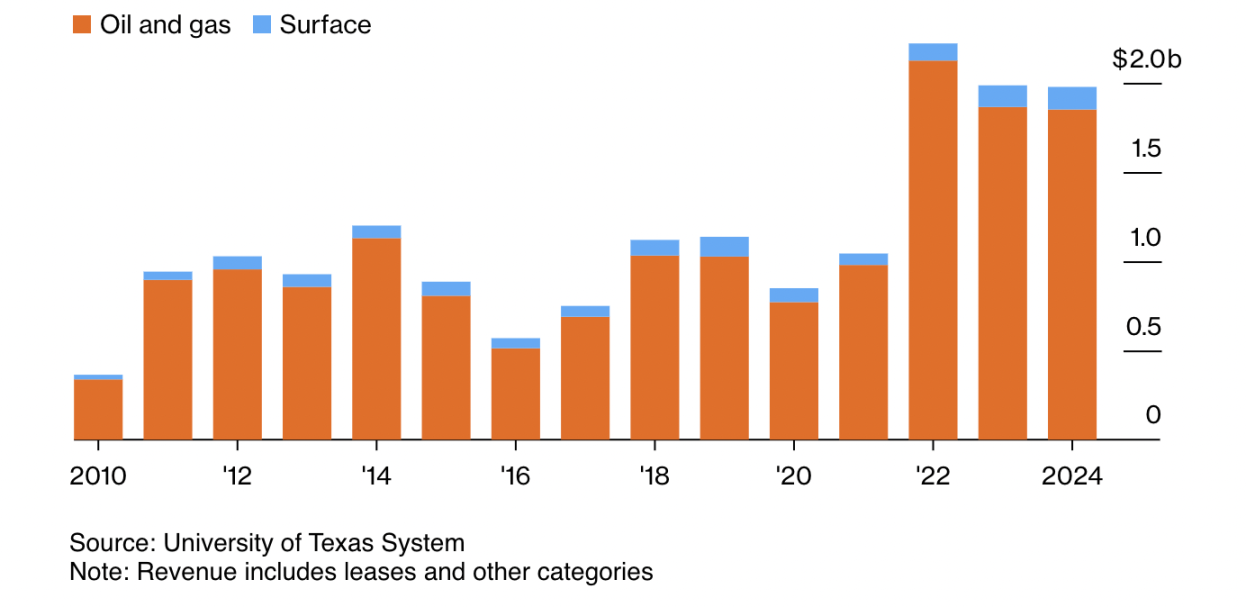 德克萨斯大学本身不勘探石油或天然气,也不开发州属土地上的任何项目。它出租这些土地,并根据石油和天然气的产量收取特许权使用费。过去 15 年,向石油和天然气公司出租的土地创造了 158 亿美元的收入。在价格和产量上涨的情况下,特许权使用费最近激增,每年收入超过 20 亿美元。