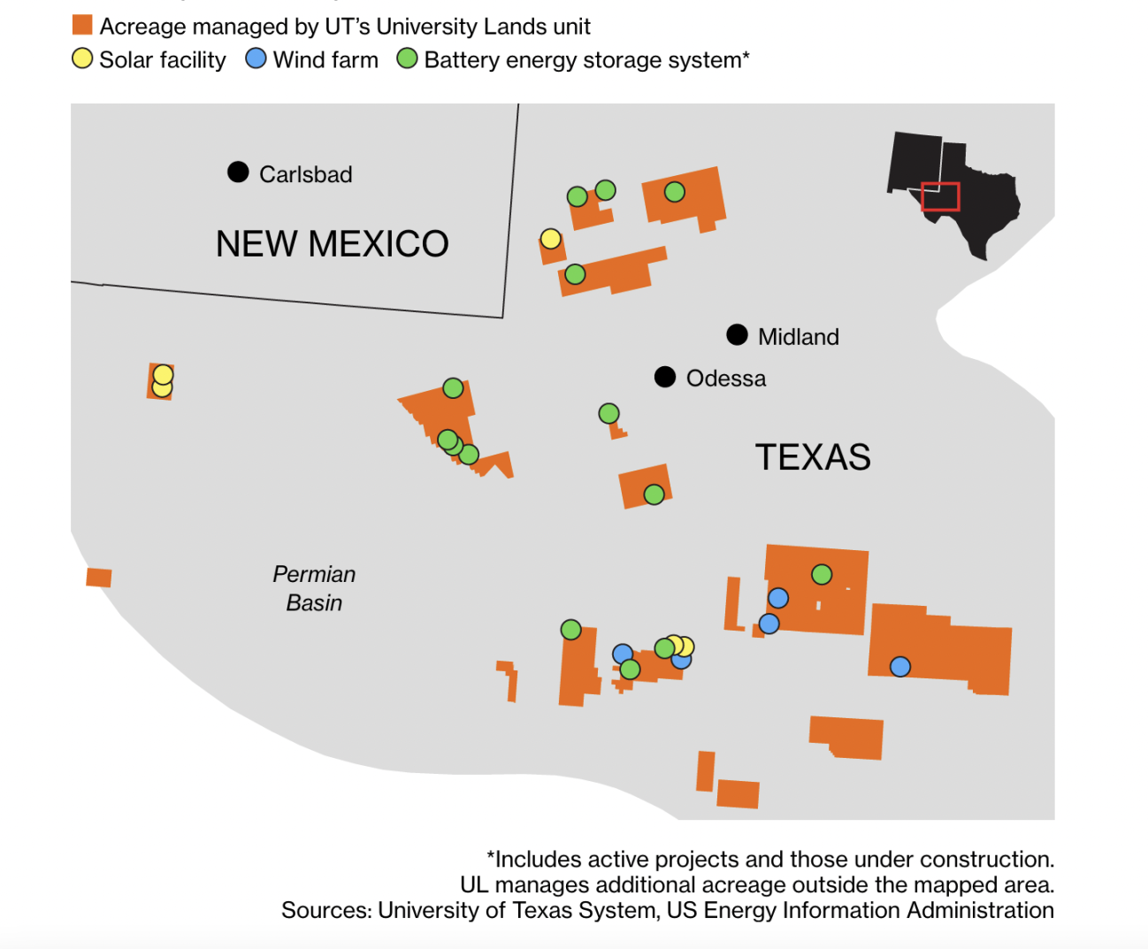 长期以来,德克萨斯大学系统一直依赖于出租其位于二叠纪盆地的庞大矿产地下资源的权益来赚钱:从北美最富饶的矿藏中开采石油和天然气。而在风车和太阳能农场下方,绵延数英里输送 「液体黄金」 的管道仍是其财富的关键。得益于多年来创纪录的化石燃料生产和投资收益,德克萨斯大学拥有 475 亿美元的捐赠基金,在高校领域排名第二,仅次于哈佛大学。