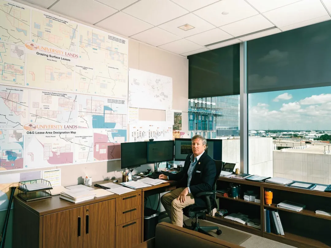 德克萨斯大学负责监督二叠纪盆地 3300 平方英里的土地,面积几乎相当于特拉华州和罗德岛州的总和,横跨 19 个县,以著名的石油小镇米德兰为中心。在 19 世纪,州宪法将这些土地的矿产和地表开采权授予了德克萨斯大学。当时,除了放牧之外,这片干旱的土地被认为几乎没有价值。但钻探者在 1923 年发现了石油,为德克萨斯州的高等教育带来了财富。