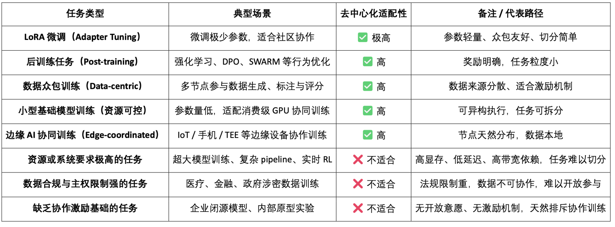 从训练范式来看,去中心化训练并不适用于所有任务类型。在某些场景中,由于任务结构复杂、资源需求极高或协作难度大,其天然不适合在异构、去信任的节点之间高效完成。例如大模型训练往往依赖高显存、低延迟与高速带宽,难以在开放网络中有效切分与同步;数据隐私与主权限制强的任务(如医疗、金融、涉密数据)受限于法律合规与伦理约束,无法开放共享;而缺乏协作激励基础的任务(如企业闭源模型或内部原型训练)则缺少外部参与动力。这些边界共同构成了当前去中心化训练的现实限制。