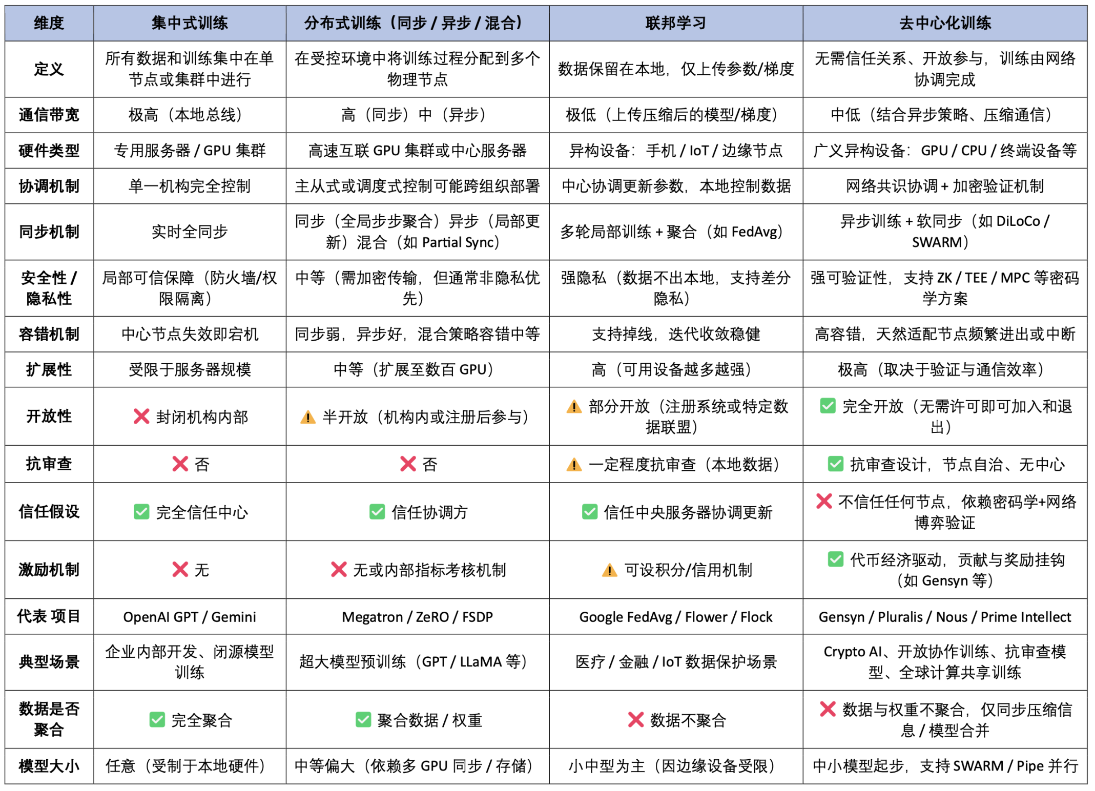 在 AI 的全价值链中,模型训练是资源消耗最大、技术门槛最高的环节,直接决定了模型的能力上限与实际应用效果。相比推理阶段的轻量级调用,训练过程需要持续的大规模算力投入、复杂的数据处理流程和高强度的优化算法支持,是 AI 系统构建的真正「重工业」。 从架构范式来看,训练方式可划分为四类:集中化训练、分布式训练、联邦学习以及本文重点讨论的去中心化训练。