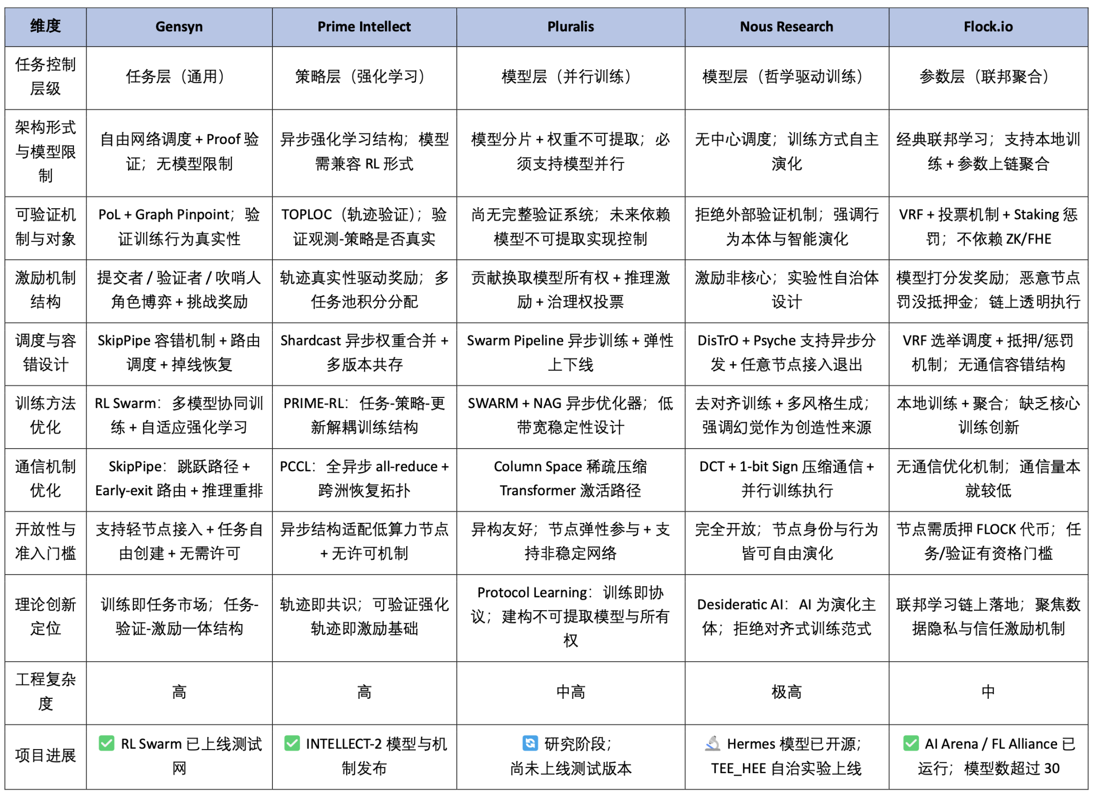 目前在去中心化训练与联邦学习前沿领域中,具有代表性的区块链项目主要包括 Prime Intellect、Pluralis.ai、Gensyn、Nous Research 与 Flock.io。从技术创新性与工程实现难度来看,Prime Intellect、Nous Research 和 Pluralis.ai 在系统架构与算法设计上提出了较多原创性探索,代表了当前理论研究的前沿方向;而 Gensyn 与 Flock.io 的实现路径相对清晰,已能看到初步的工程化进展。本文将依次解析这五个项目背后的核心技术与工程架构路,并进一步探讨其在去中心化 AI 训练体系中的差异与互补关系。