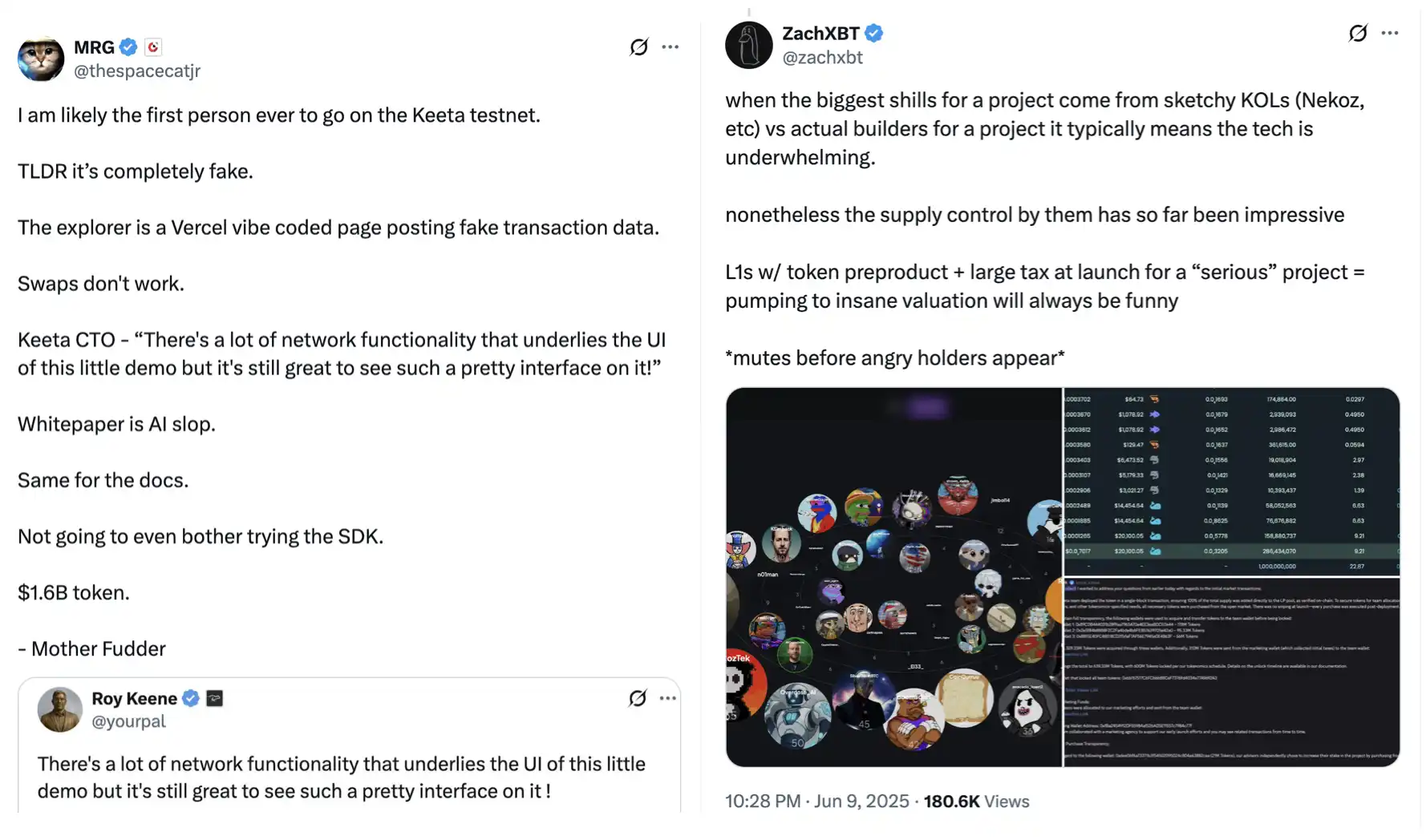 社区用户 MRG(@thespacecatjr)表示体验过 Keeta 测试网后认为这个项目完全是假的,「区块浏览器是个用 Vercel 搭的假页面,上面展示的交易数据是伪造的。Swap 功能根本无法使用。白皮书是 AI 拼凑的垃圾,文档也是一样。甚至懒得去试他们的 SDK。」