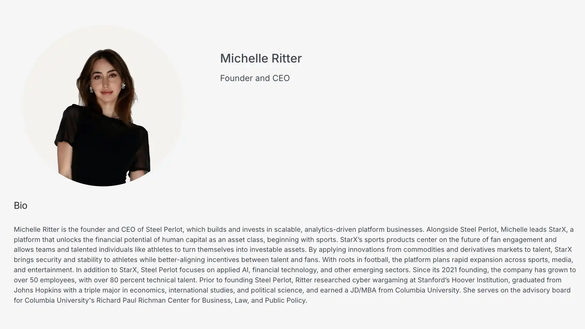 在《The Information》的报道中,Ritter 和 Schmidt 俩人在 2020 年相遇后,开始讨论有关商业战略的大想法。最终,Ritter 提出了她对 Steel Perlot 的愿景——一种新型对冲基金,使用先进的交易策略,同时孵化涉及支付、加密货币、人工智能和创客经济的初创企业。
