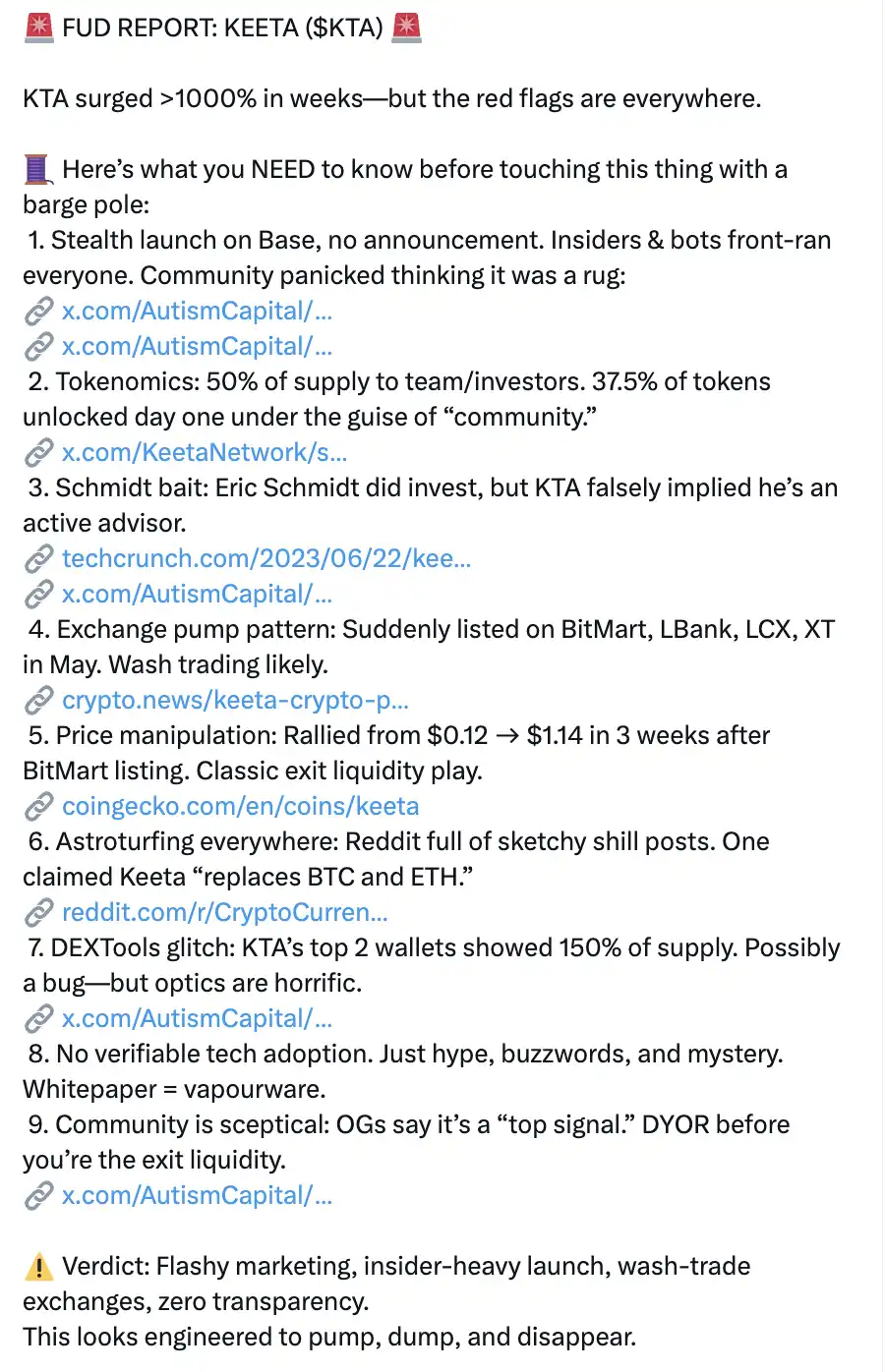 目前,$KTA 的价格仍处于极高估值阶段,社区对其代币流动性控制、KOL 操盘痕迹及其幕后团队的质疑仍在继续发酵。一旦所谓 1000 万 TPS 测试未能如期或如实完成,Keeta 项目将面临更为严重的信任危机。