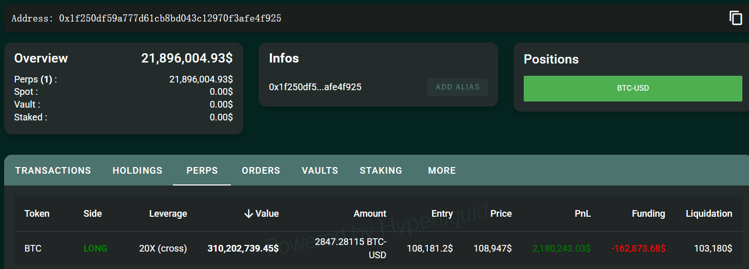 据 Hypurrscan 区块链数据 显示 ,一位神秘巨鲸(钱包地址:0x1f250df59a777d61cb8bd043c12970f3afe4f925)在去中心化交易所 Hyperliquid 上𫔭啟了一笔 20 倍杠桿的比特币多头合约,总价值高达 3.08 亿美元,进场价格为 108,100 美元。目前,这笔交易已经浮盈 218 万美元,清算价格为 103,180 美元。
