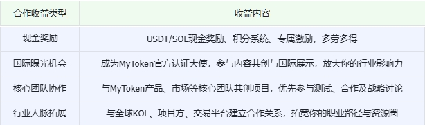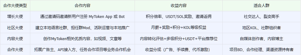 作为一个聚集了大量加密货币交易者的平台,我们非常激动地推出全球大使计划。成为 MyToken 大使后,您将在提升品牌知名度、创作优质内容、参与社区互动以及支持生态发展等方面发挥关键作用。